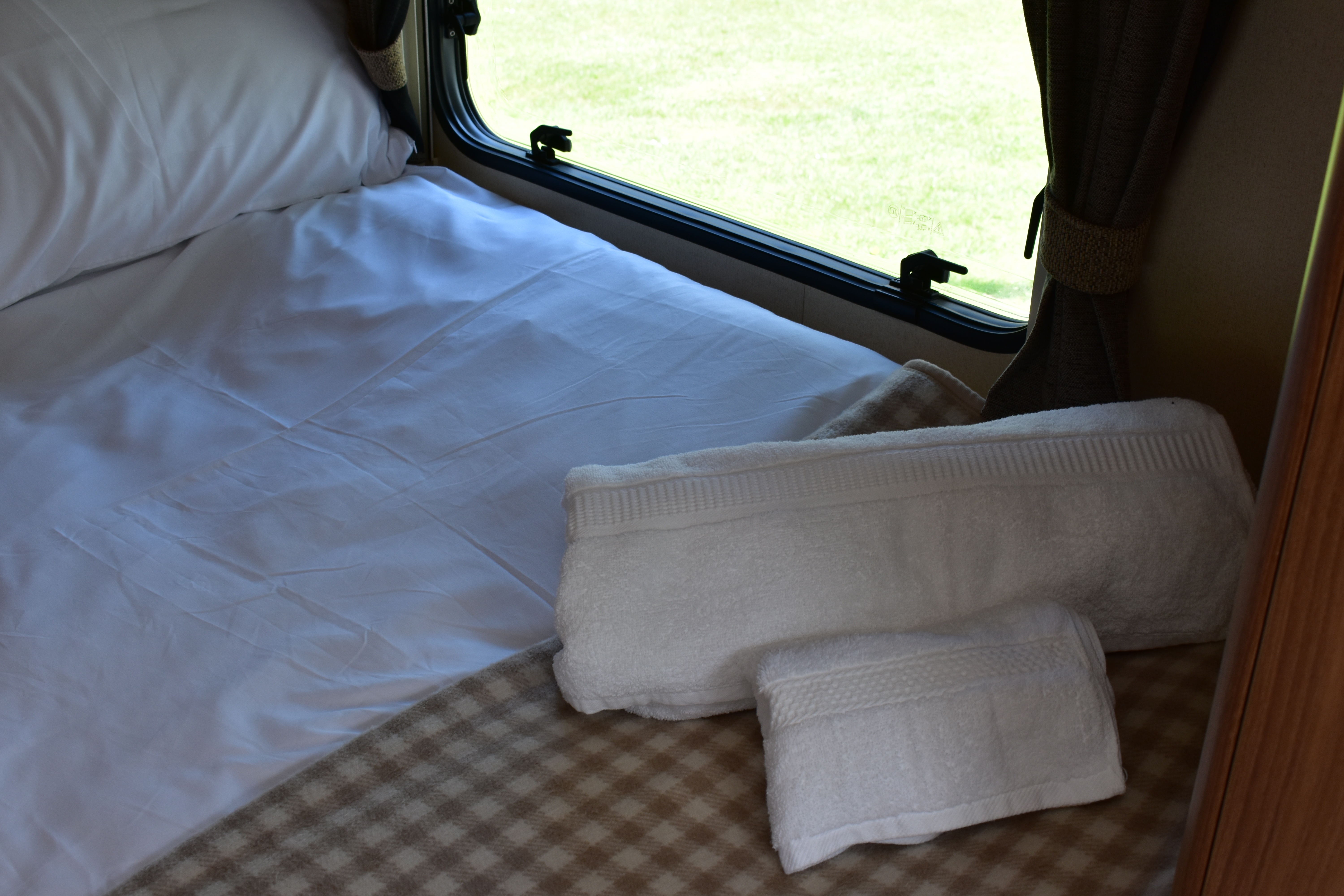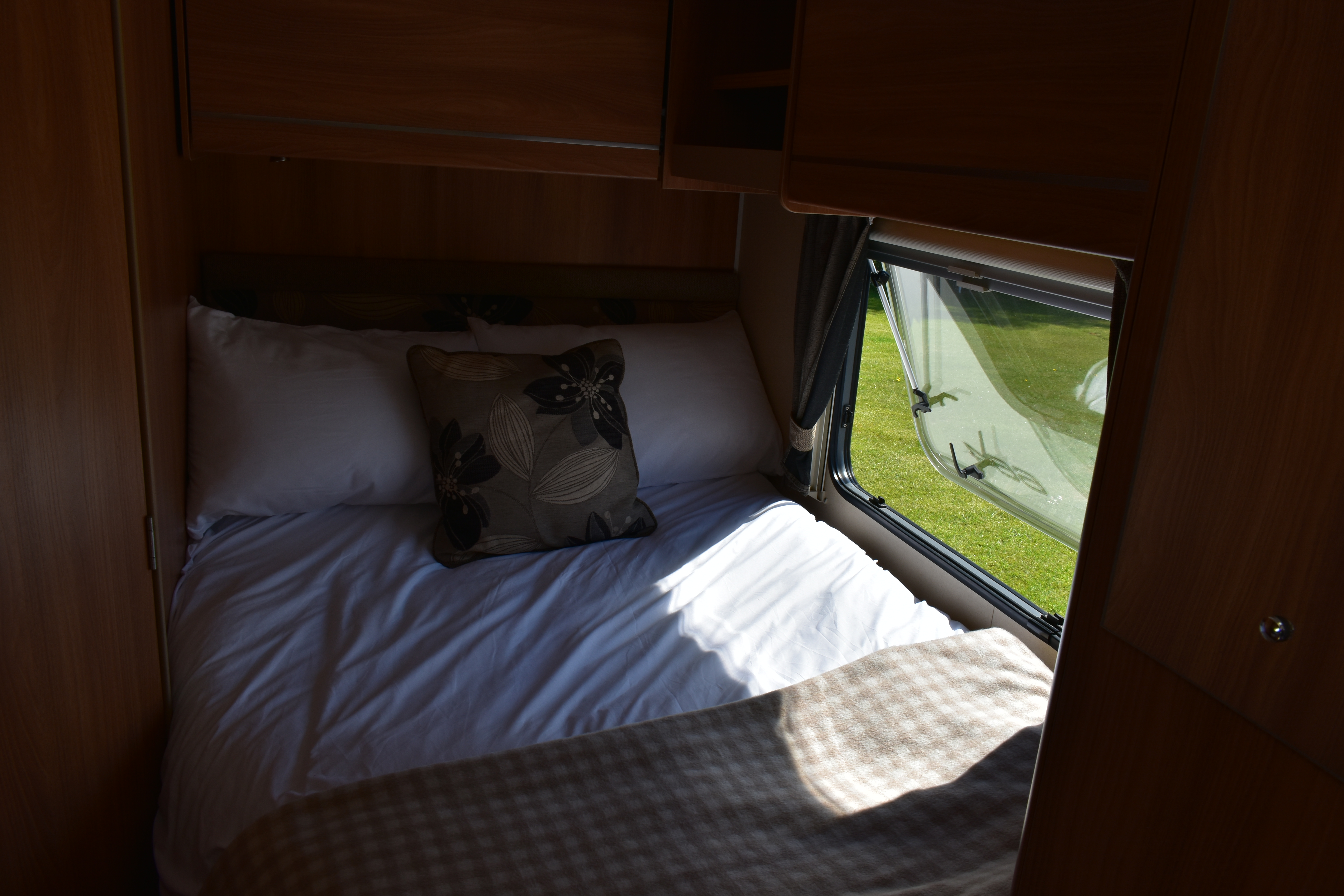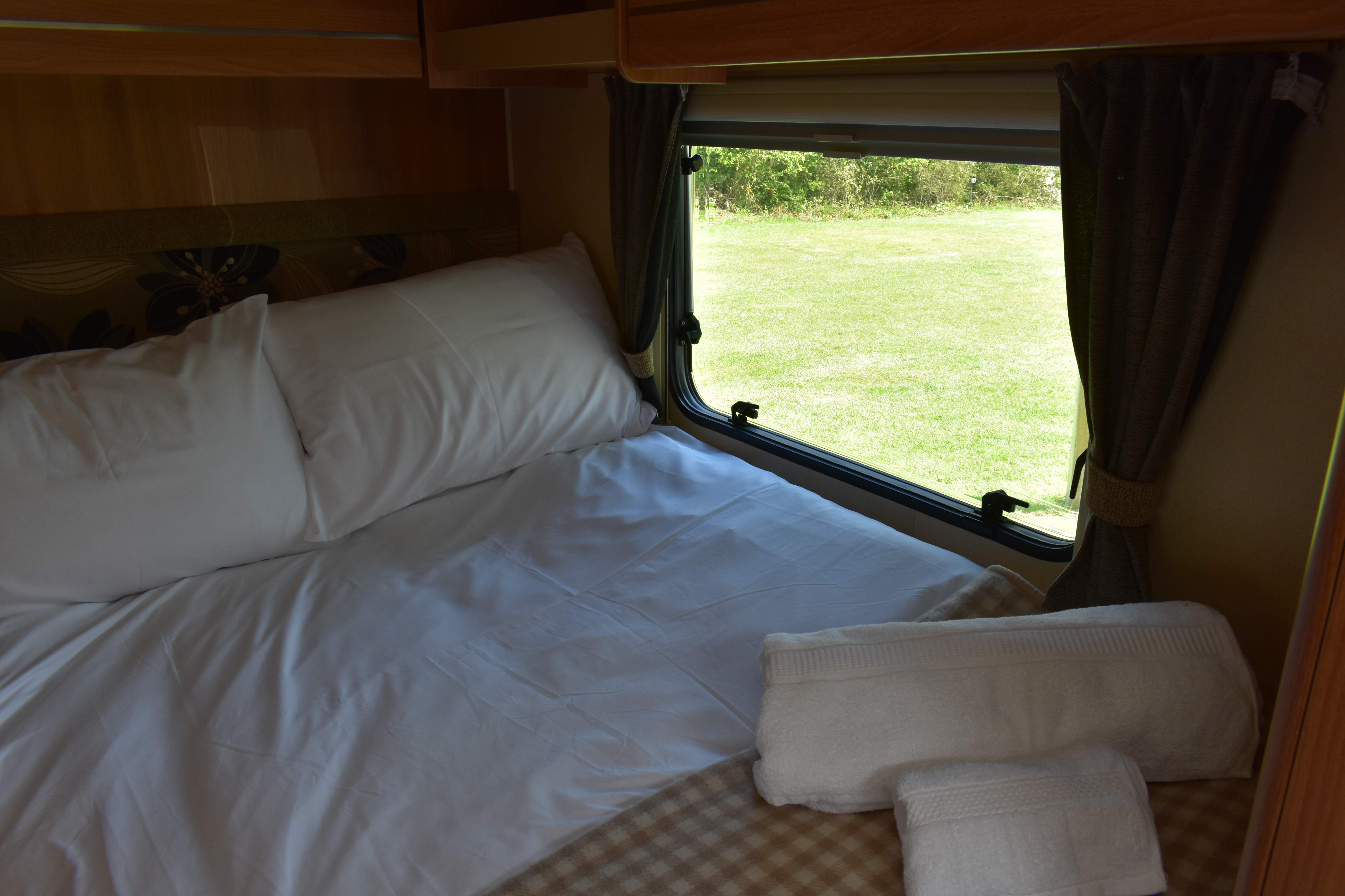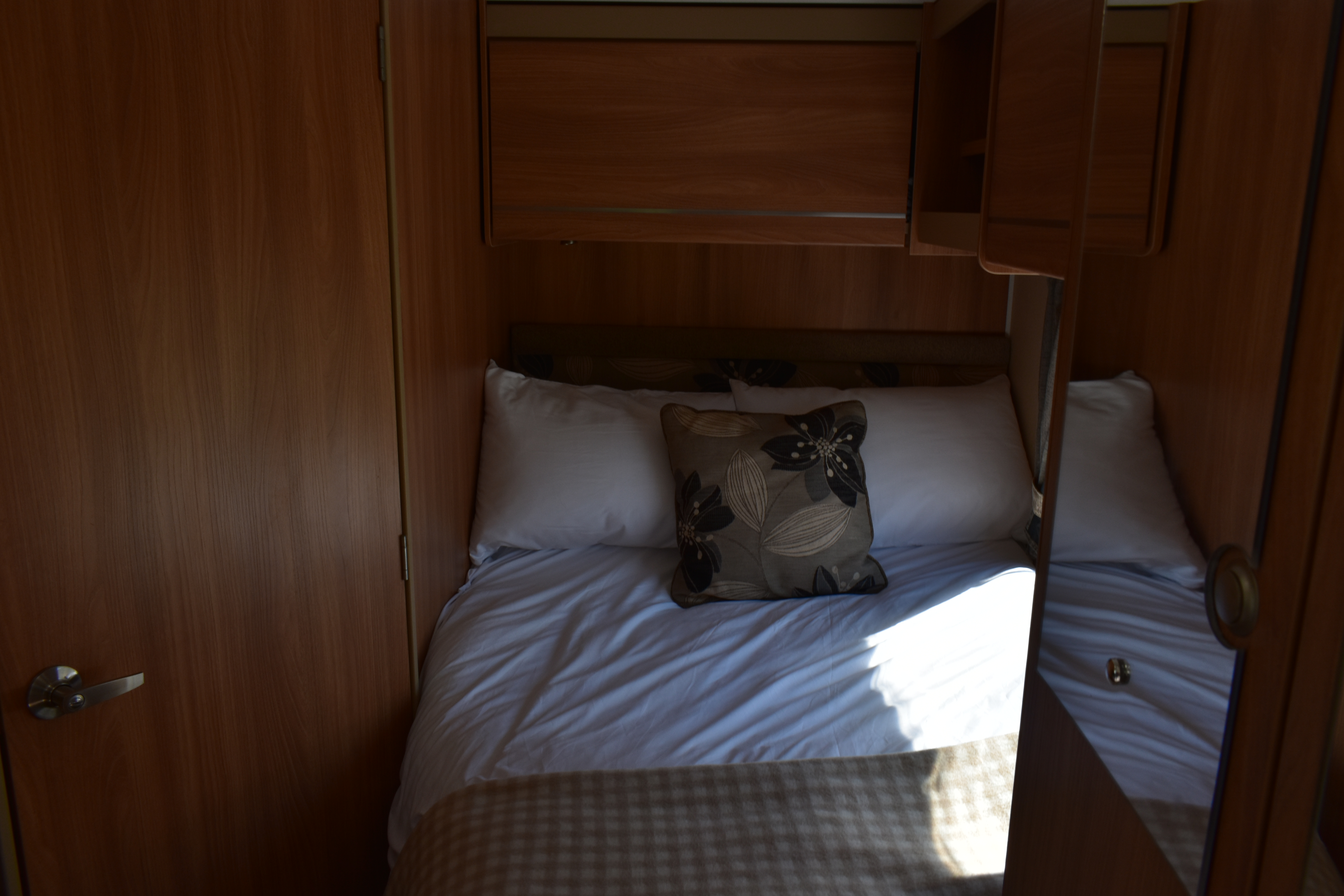 The fixed double French bed is a comfortable sleeping area. Privacy curtain between kitchen and bed. Reading lights above the headboard. Plenty of overhead cupboard space and a fitted wardrobe. Linens provided.