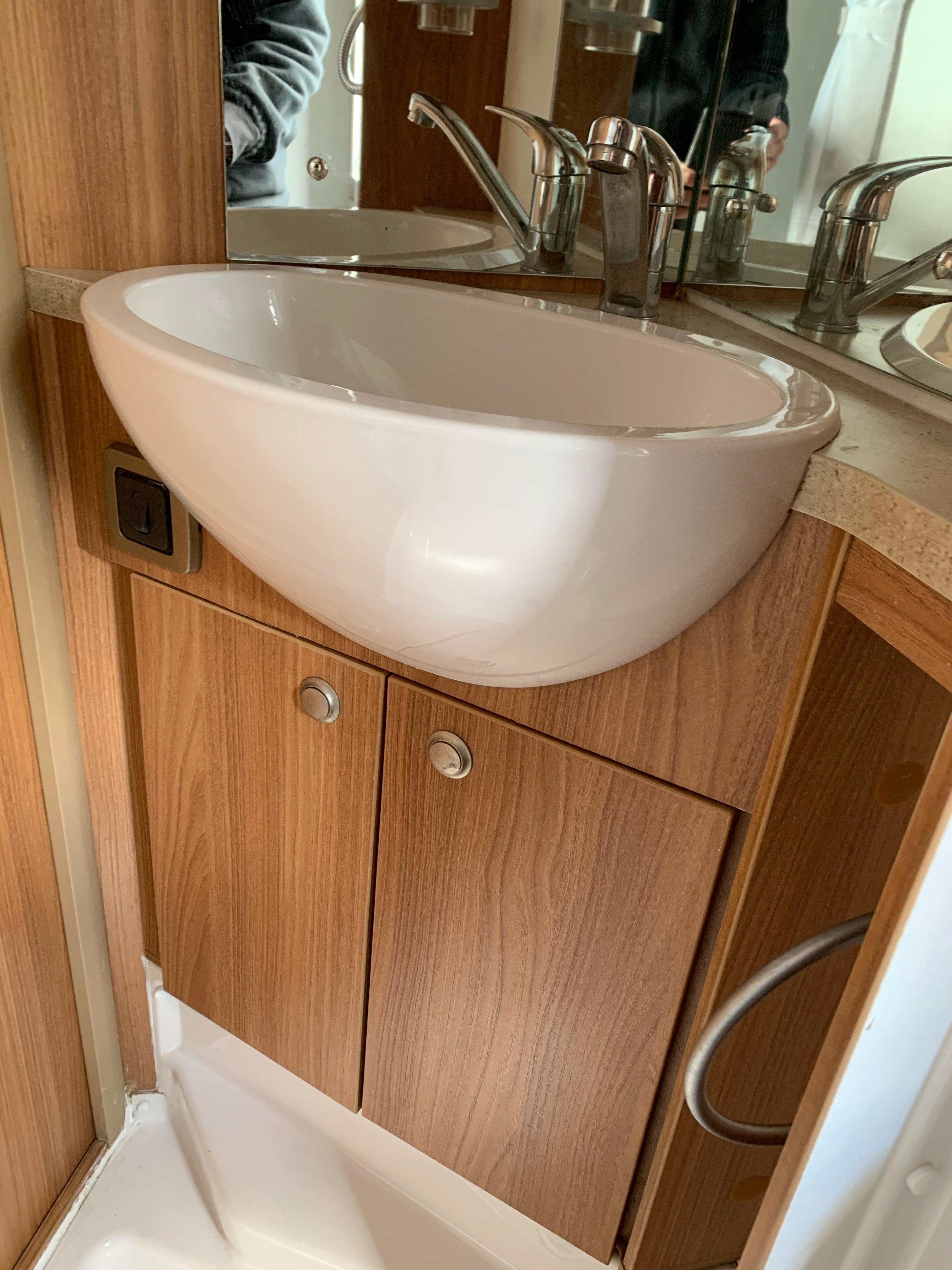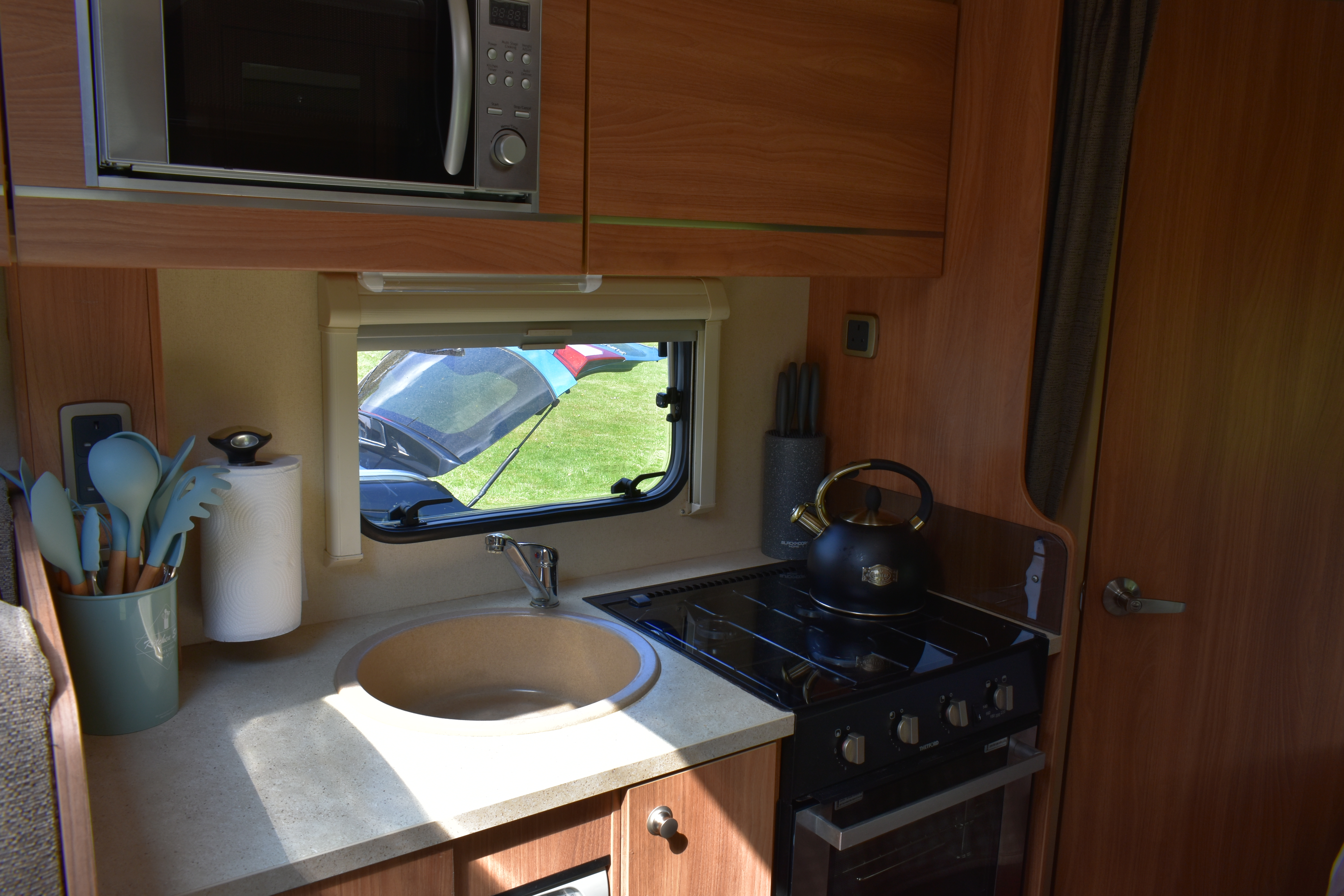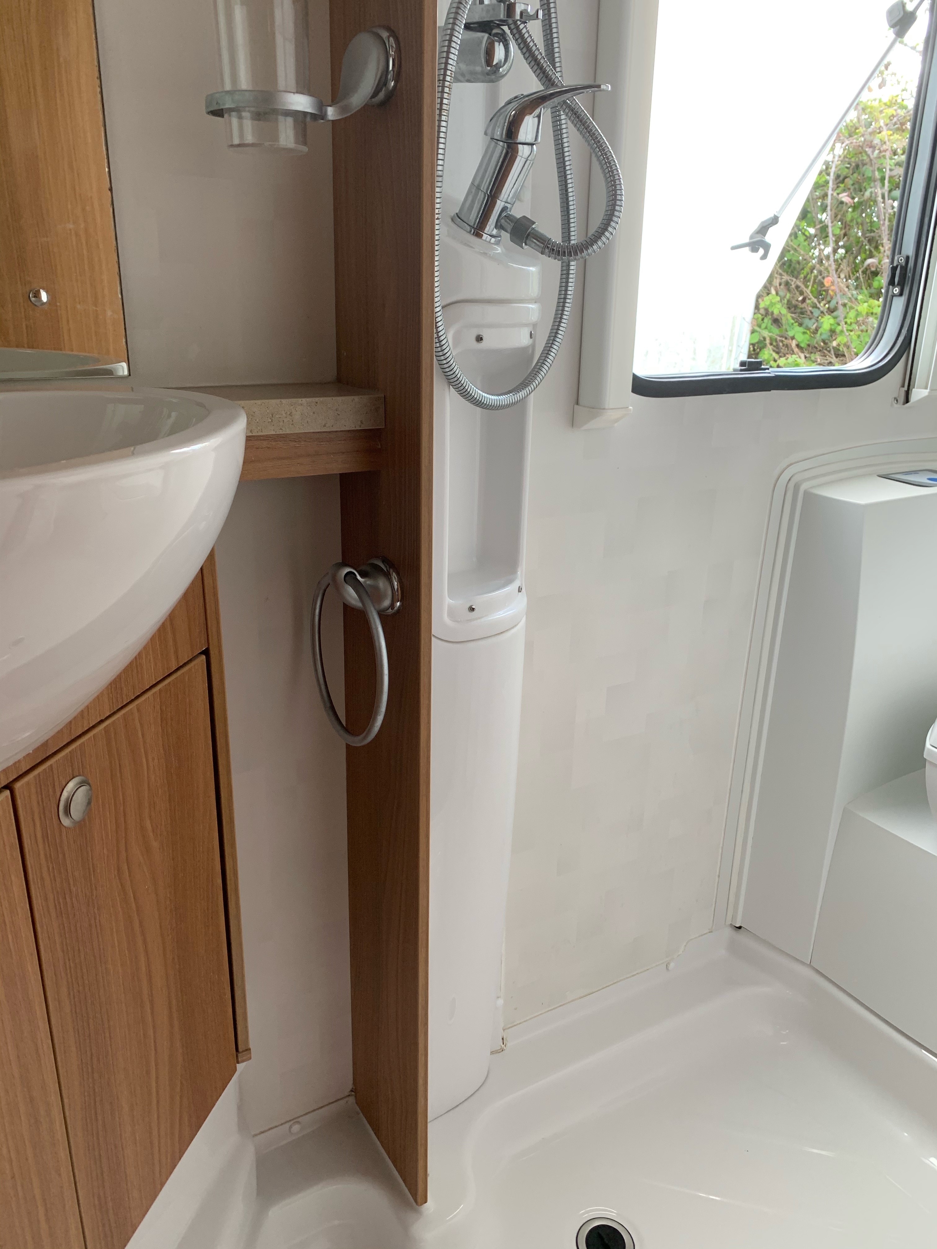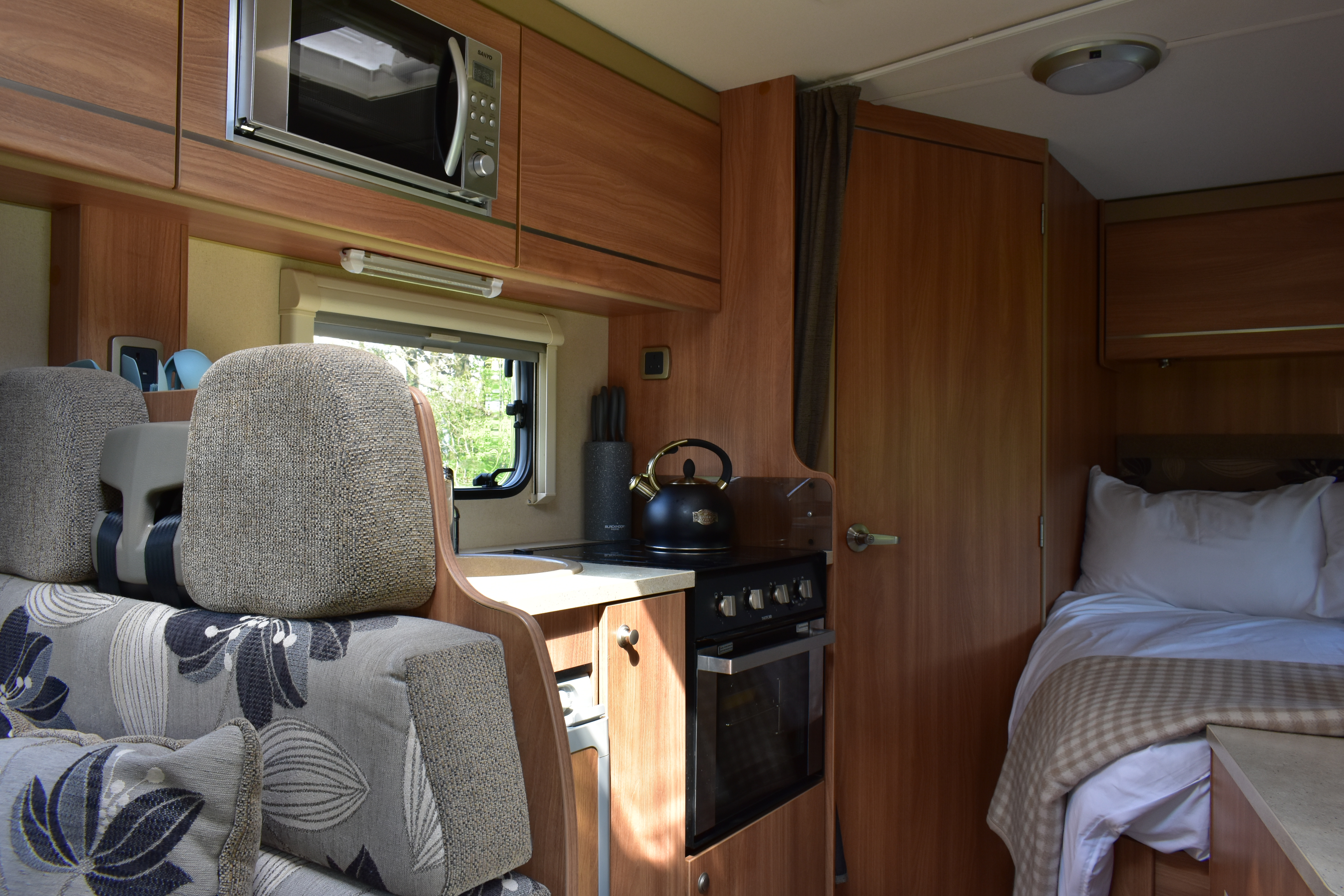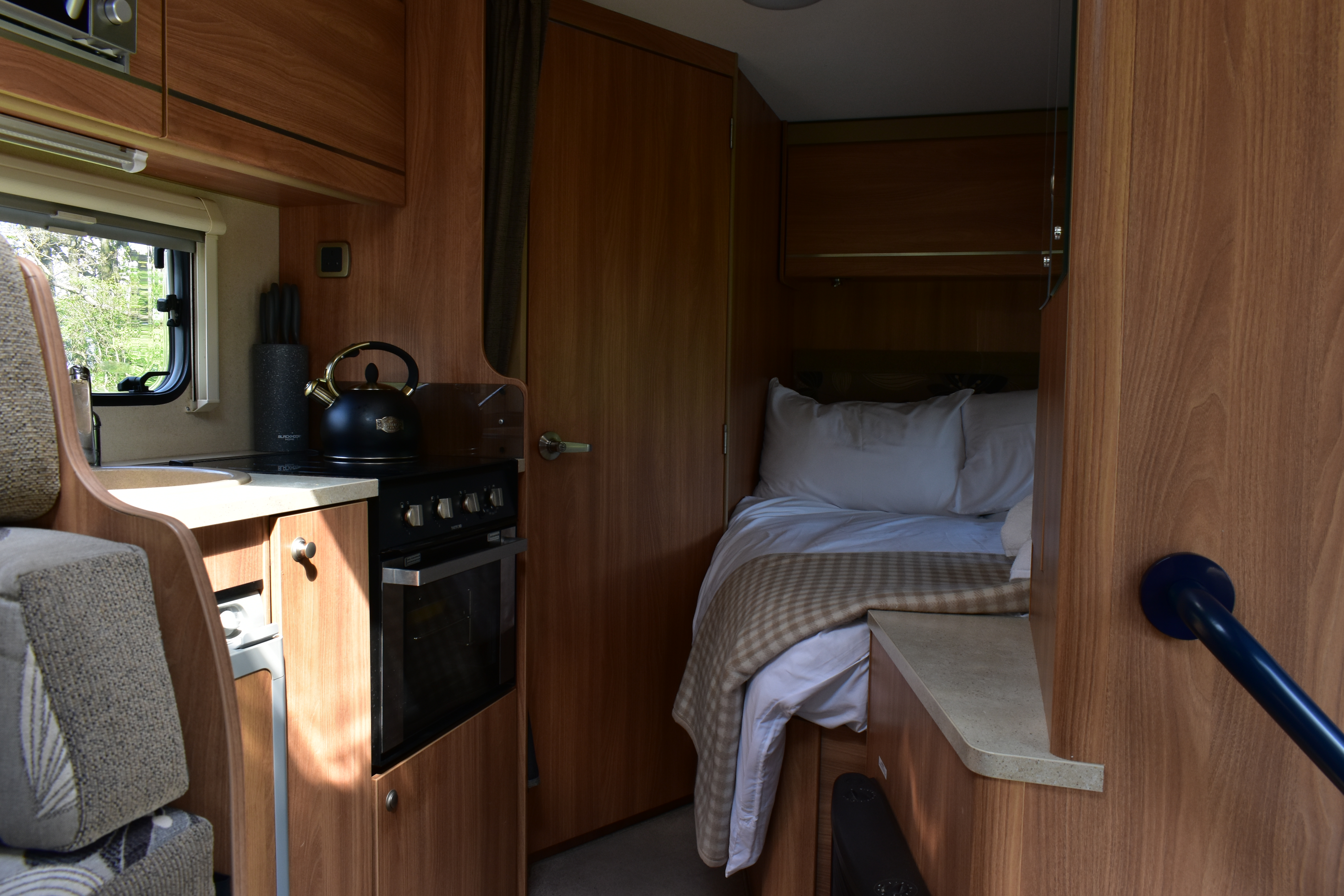 The fixed double French bed is a comfortable sleeping area. Privacy curtain between kitchen and bed. Reading lights above the headboard. Plenty of overhead cupboard space and a fitted wardrobe. Linens provided.