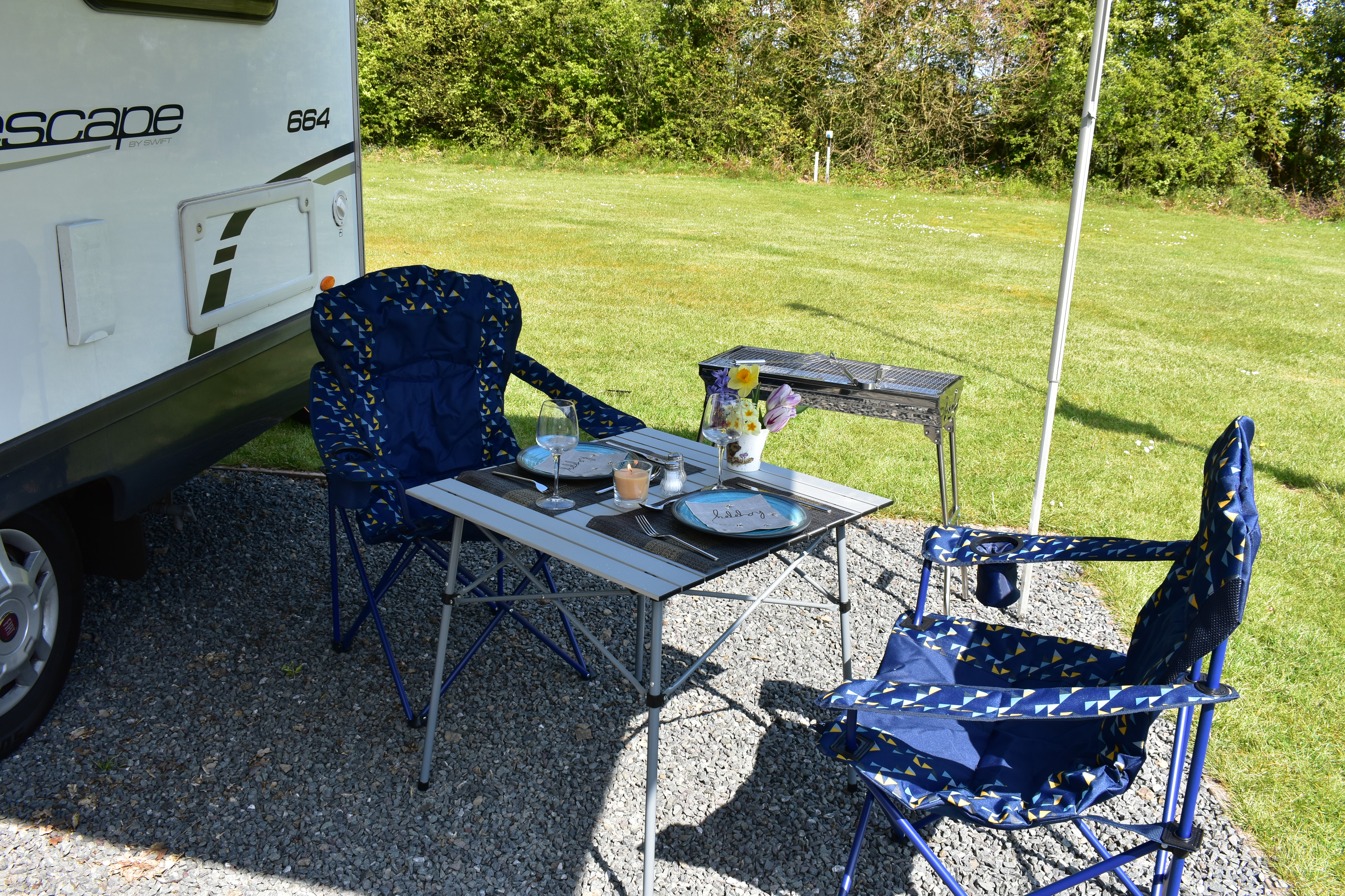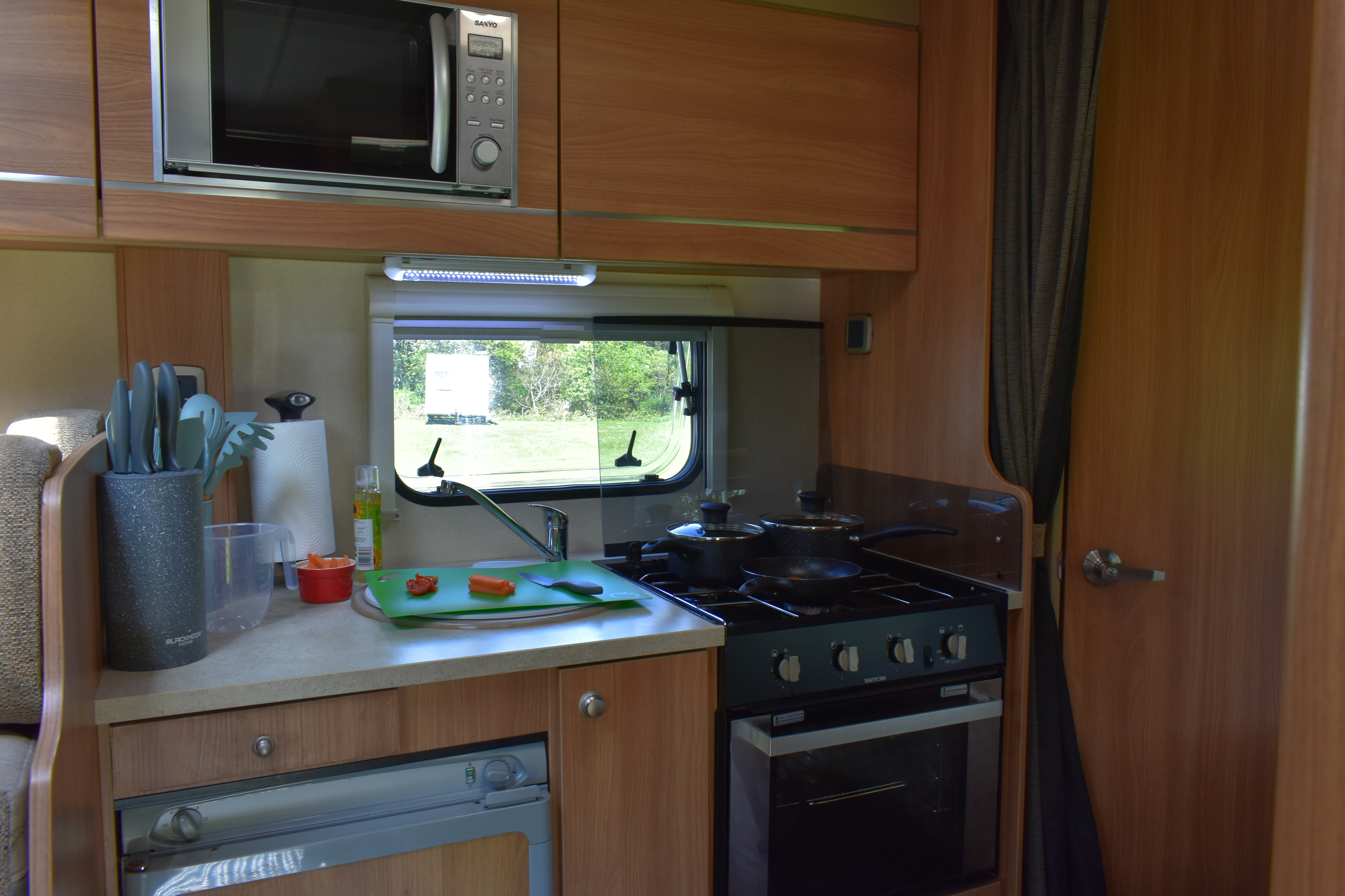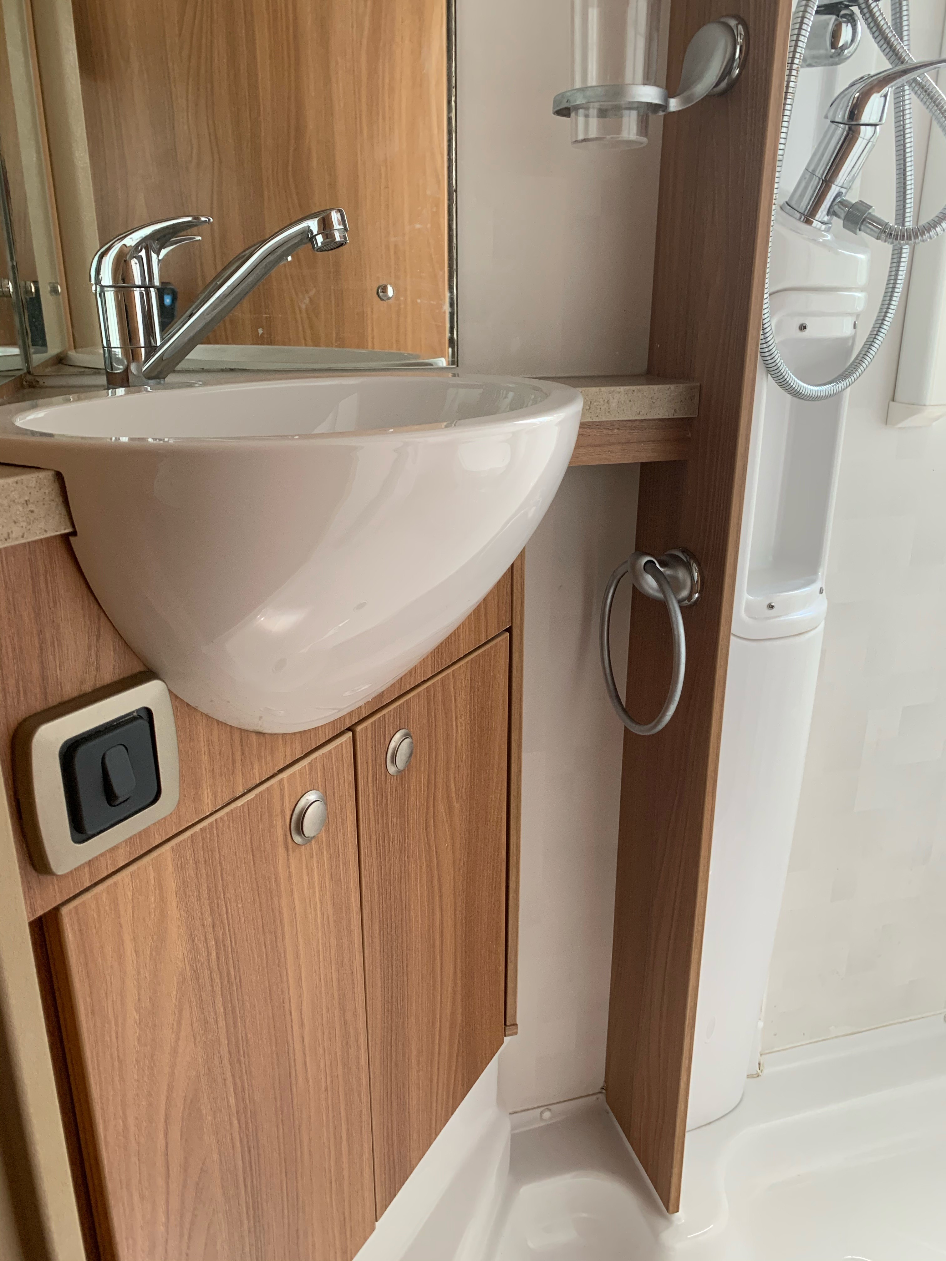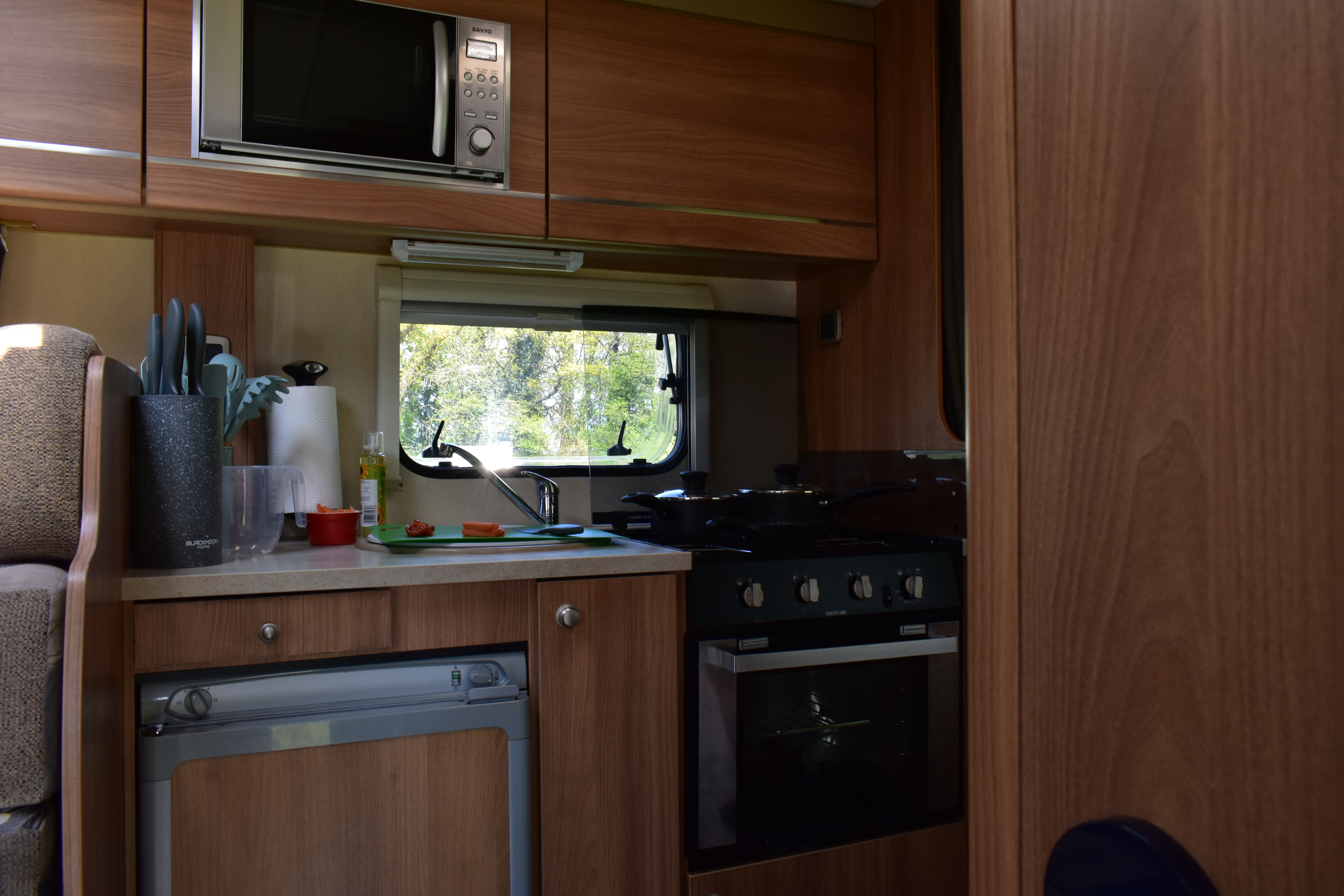 The fixed double French bed is a comfortable sleeping area. Privacy curtain between kitchen and bed. Reading lights above the headboard. Plenty of overhead cupboard space and a fitted wardrobe. Linens provided.